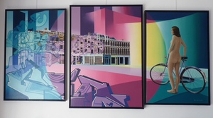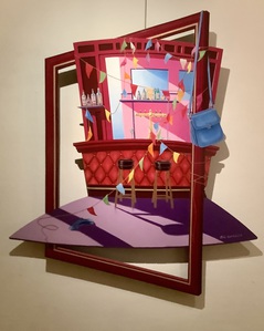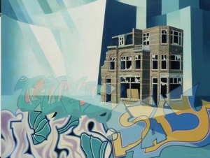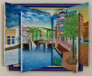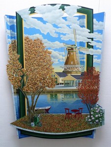 2007Ingezaagd paneel.Twee-dimensionaal werk met sterk ruimtelijke suggestie Het schilderij is niet meer te koop, maarals kleine kleurvaste Kunstreproductie (GICLEE) nog wel verkrijgbaar. Zie: GICLEE,S