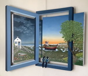 Olieverfschilderijingezaagd paneel met aan de achterkant een kleine verhoging zodat het schilderij iets los hangt van de wand ( 3 cm.) waardoor de suggestie van ruimte en diepte wordt bereiktversterkt.... Meer info e.kerkvliet@ziggo.nl